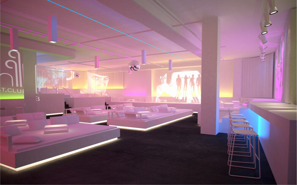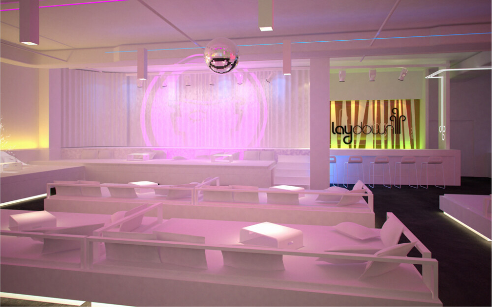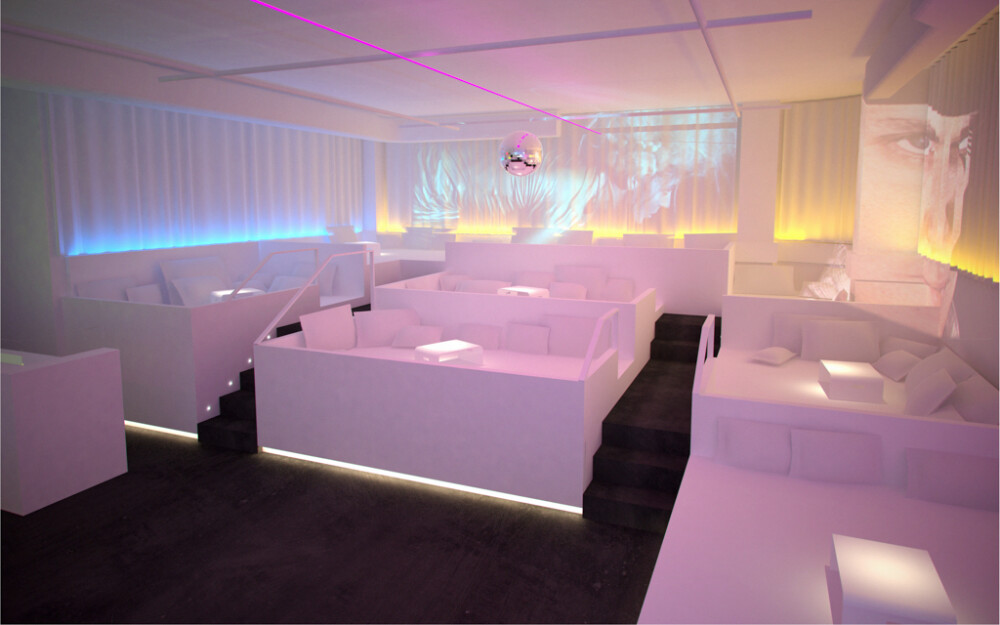 White is the predominant color throughout the interior of the restaurant, which allows us, thanks to the LED lighting system, to dye the whole place in any color. The great singularity of this restaurant is, without a doubt, its beds -designed by us-, where you can dine lying down, drink, and even dance barefoot. At the back of the restaurant and elevated from the rest of the place, is the VIP area, as small boxes-beds. In the bathrooms, a more baroque aesthetic was chosen, with evident Art Deco reminiscences, which contrasts with the rest of the restaurant.