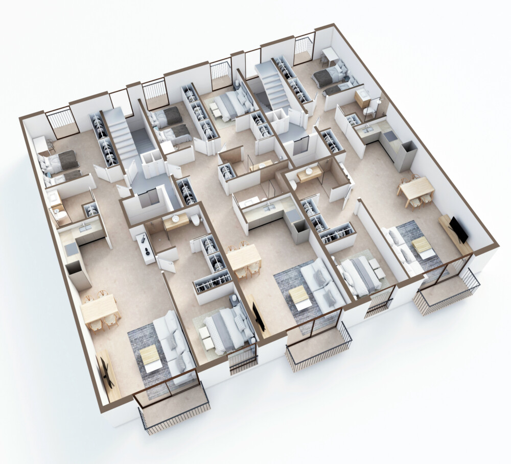 The project aims, through a contemporary approach to layouts and finishes, to achieve a unique architectural unity that blends into the historic surroundings of the Ruzafa neighborhood. To this end, the layouts have been conceived as connected, open spaces of great spaciousness and functionality, with top-quality materials and finishes and meticulous execution.